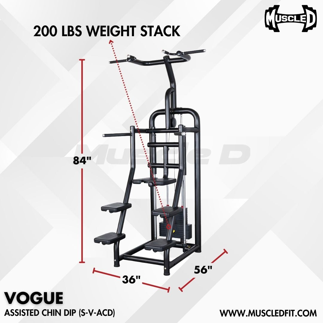 Transform your upper body training with the Vogue Selectorized Assisted Chin/Dip Machine by Muscle D Fitness. This commercial-grade strength training equipment combines precision engineering with versatile functionality, making assisted pull-ups and dips accessible for all fitness levels while supporting progressive overload training.
